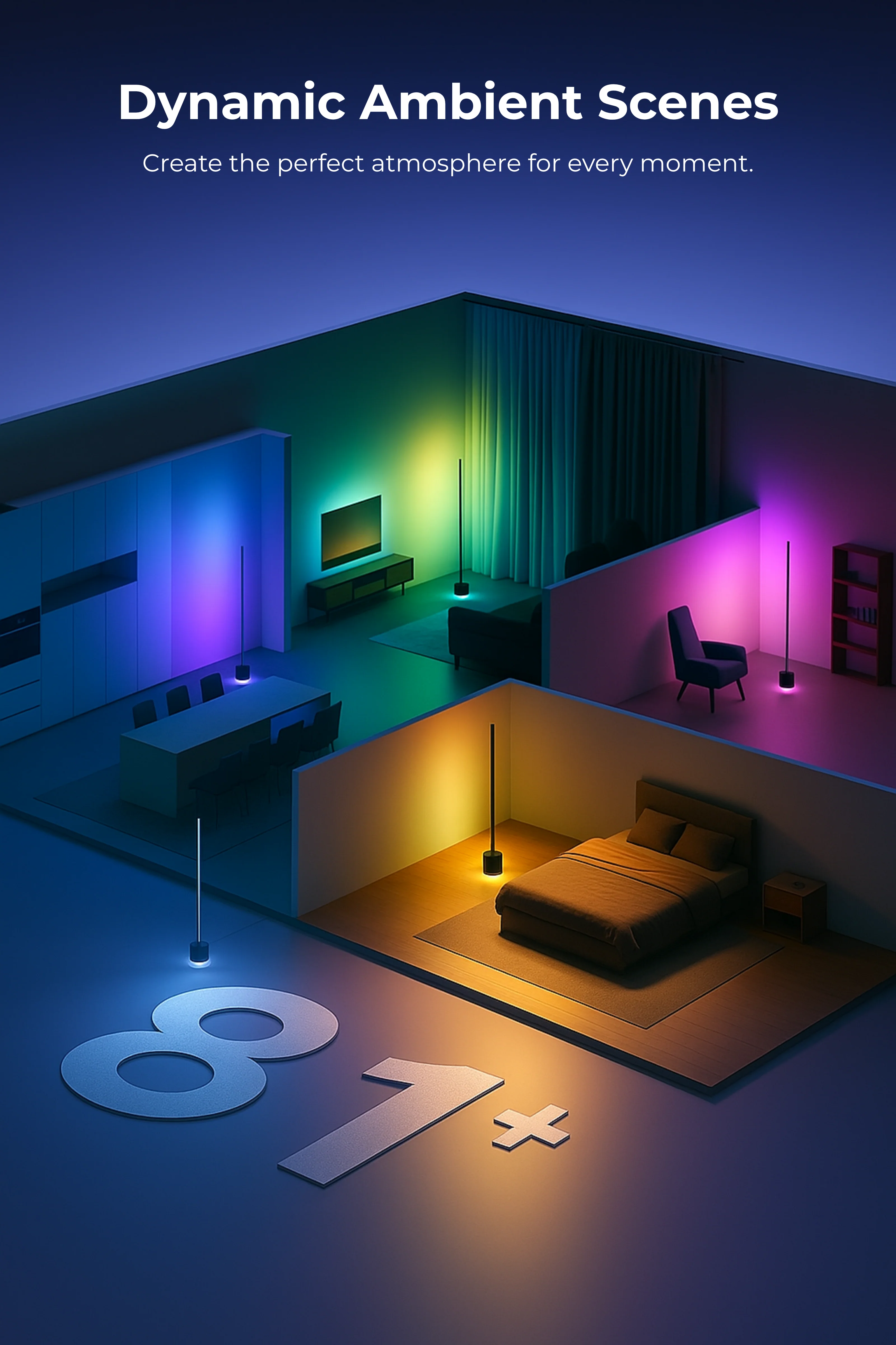 With over 80 customizable scene effects, you can match your lighting to your mood — from cozy nights to gaming sessions to festive celebrations. Each scene transforms your room into a masterpiece of color and creativity.